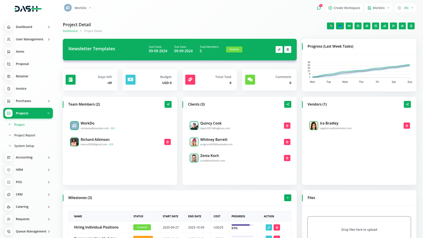 Attach cost and summary to milestones and change the status through the drop-down menu. Get a tab on recent activities of a project and also a graph about progress. Along with that, you can check your tasks’ details under project details with the help of the Gantt Chart.